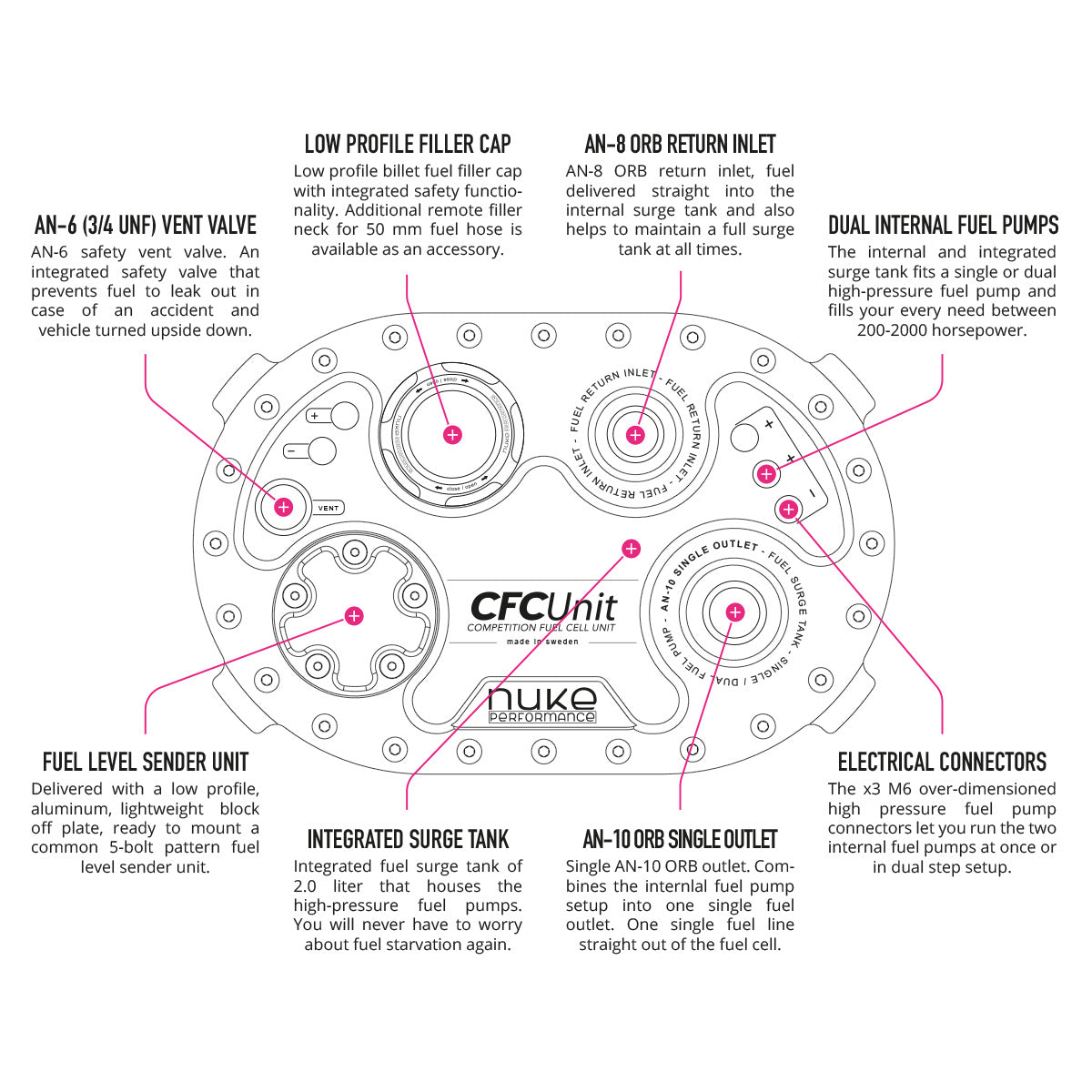 The Nuke Performance CFC Unit - Low profile Competition Fuel Cell Unit, with an integrated fuel surge tank, is now equipped with ORB threads. The AN-10 ORB outlet port and the AN-8 ORB return port lets you choose from a wide range of different available ORB fittings. The use of the oversized, high-flow AN-10 ORB outlet combines the internal fuel pumps into one single fuel line and minimizes the need for external equipment, hoses, and fittings. The included rollover-protected vent fitting is of AN-6 (3/4 UNF) and can be swapped for AN-6 to AN-10 when needed. Outlet and return AN-6, AN-8, AN-10, and AN-12 fittings are sold separately as accessories.