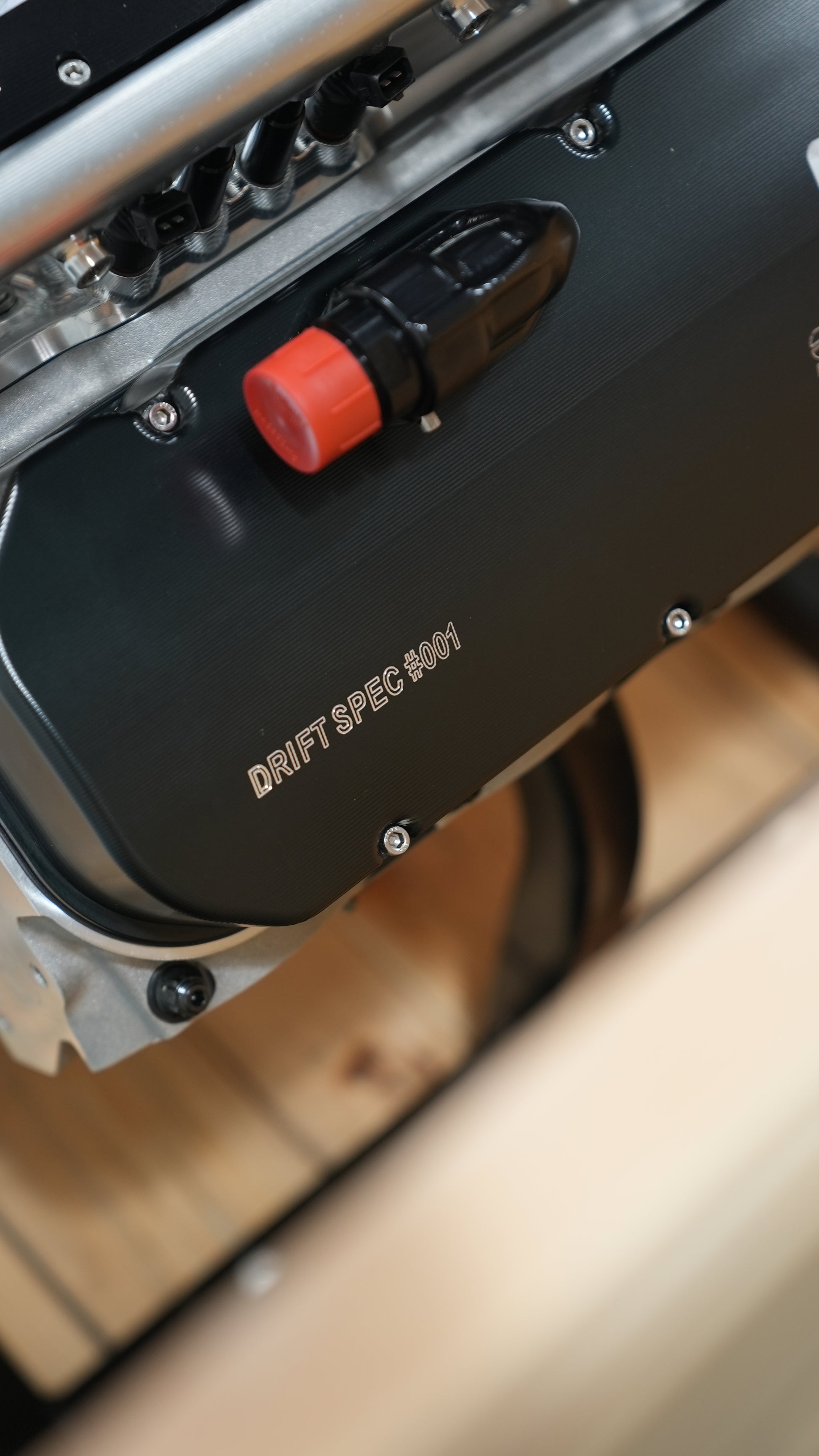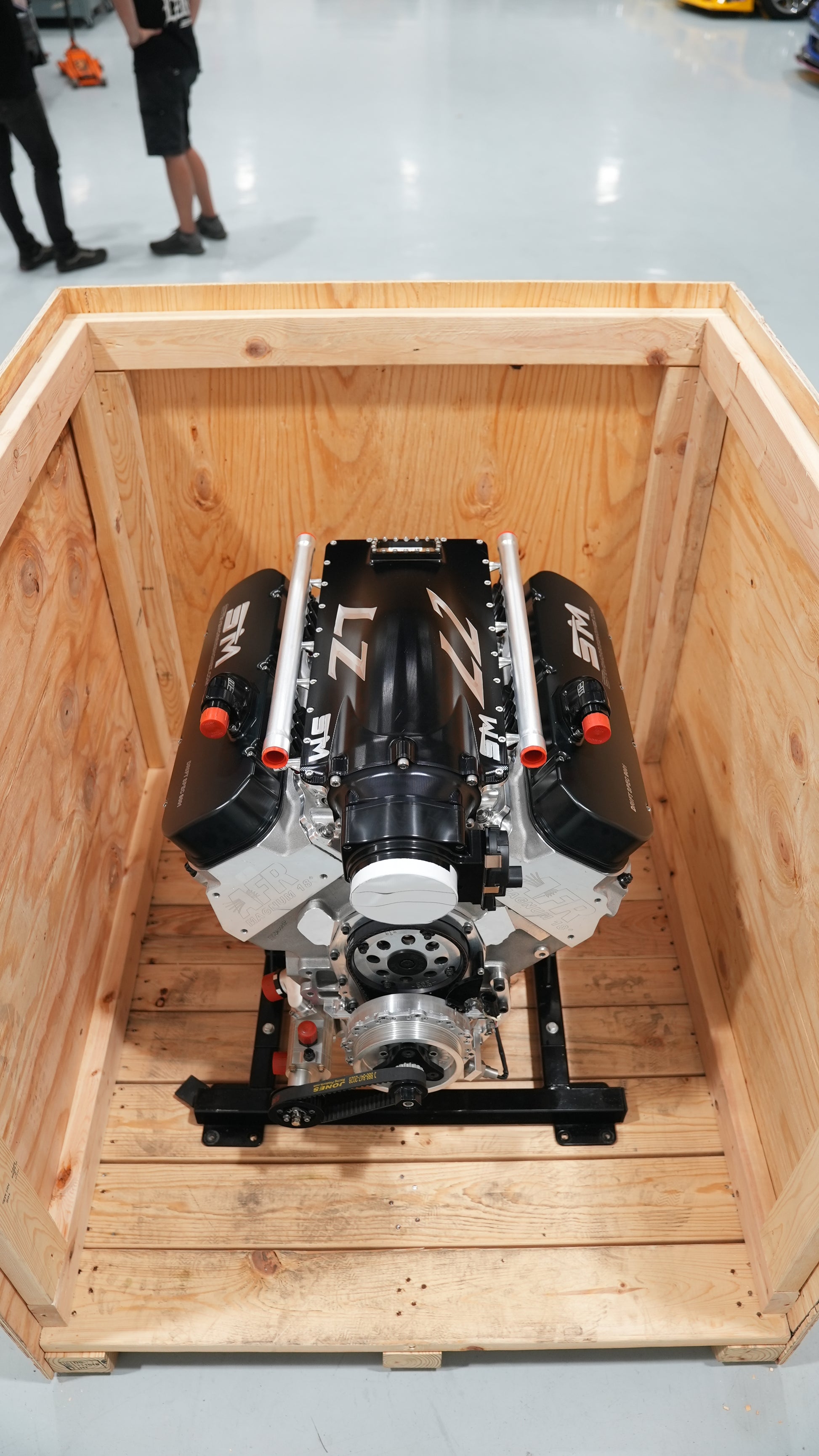 Engine is dressed with intake, injectors, dry sump - no headers, no motor plate, no alternator, no starter.